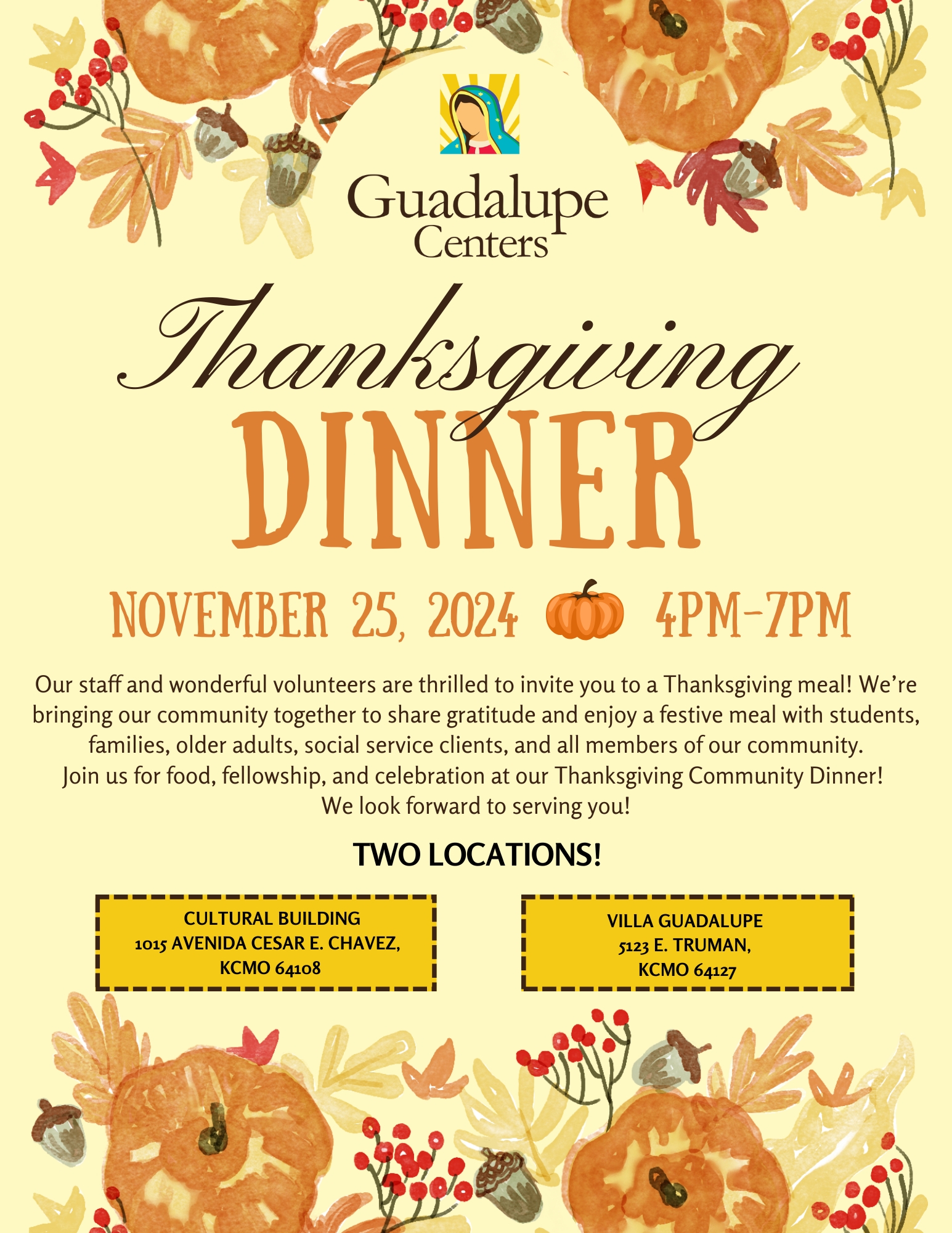 This Thanksgiving, Guadalupe Centers is thrilled to come together at Two special locations: the Villa Campus (Guadalupe Elementary School) and the Cultural Admin Building, to serve delicious meals to our beloved community.
