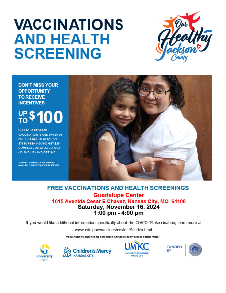 FREE VACCINATIONS AND HEALTH SCREENING RECEIVE A COVID-19 VACCINATION (5 AND UP) SHOT AND GET $40. RECEIVE AN STI SCREENING AND GET $20. COMPLETE AN OHJC SURVEY (13 AND UP) AND GET  $40