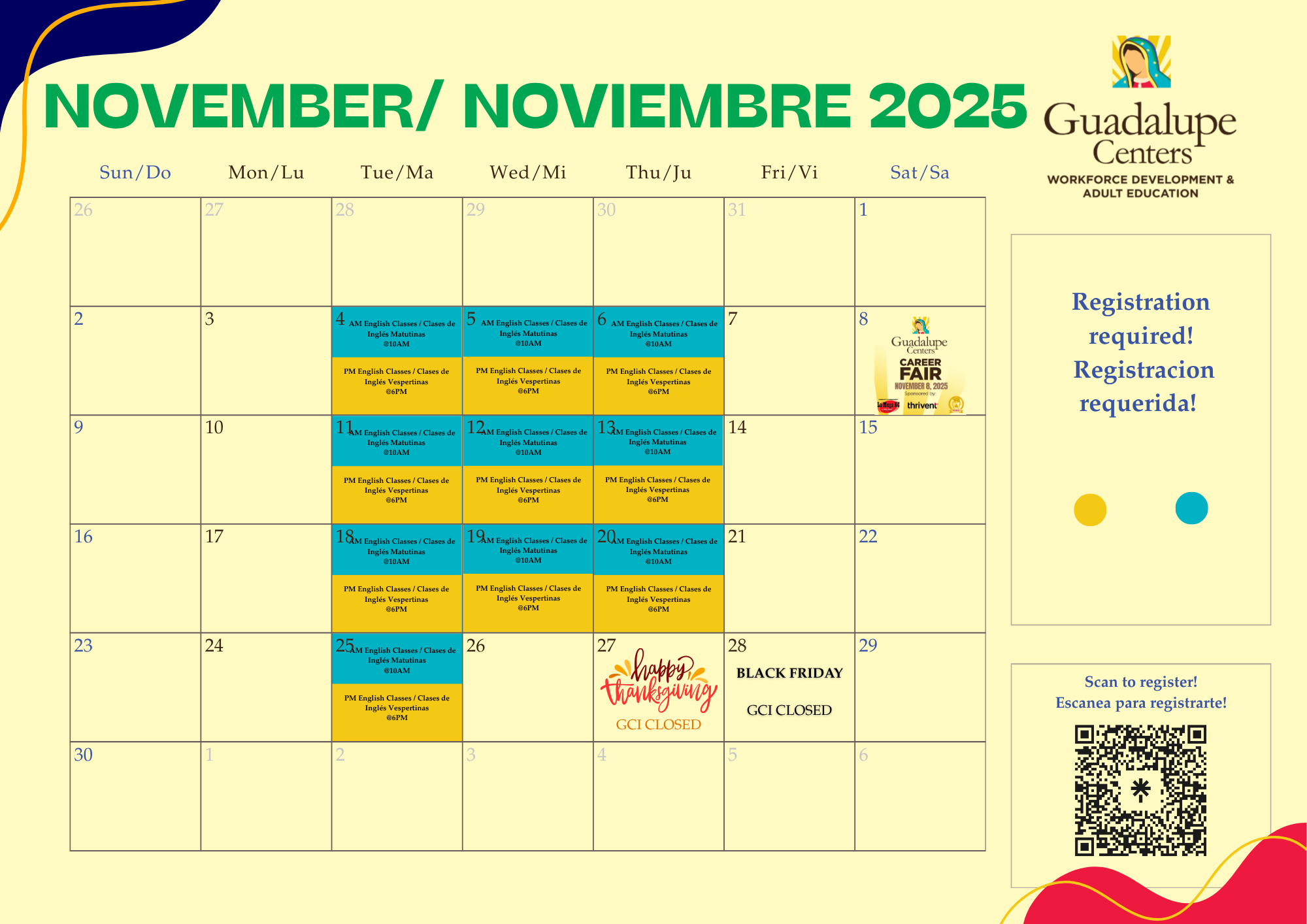 Guadalupe Center’s Adult Education program offers four 12-week sessions of ELL classes per year. The first 2 weeks cover Digital Literacy and computer familiarity; the following 10 weeks are the ELL Curriculum program. Our program provides extensive one-on-one support, supplemental skills-building workshops, and wrap-around services via our workforce coaches. Our program is open for learners 18 years of age and older.